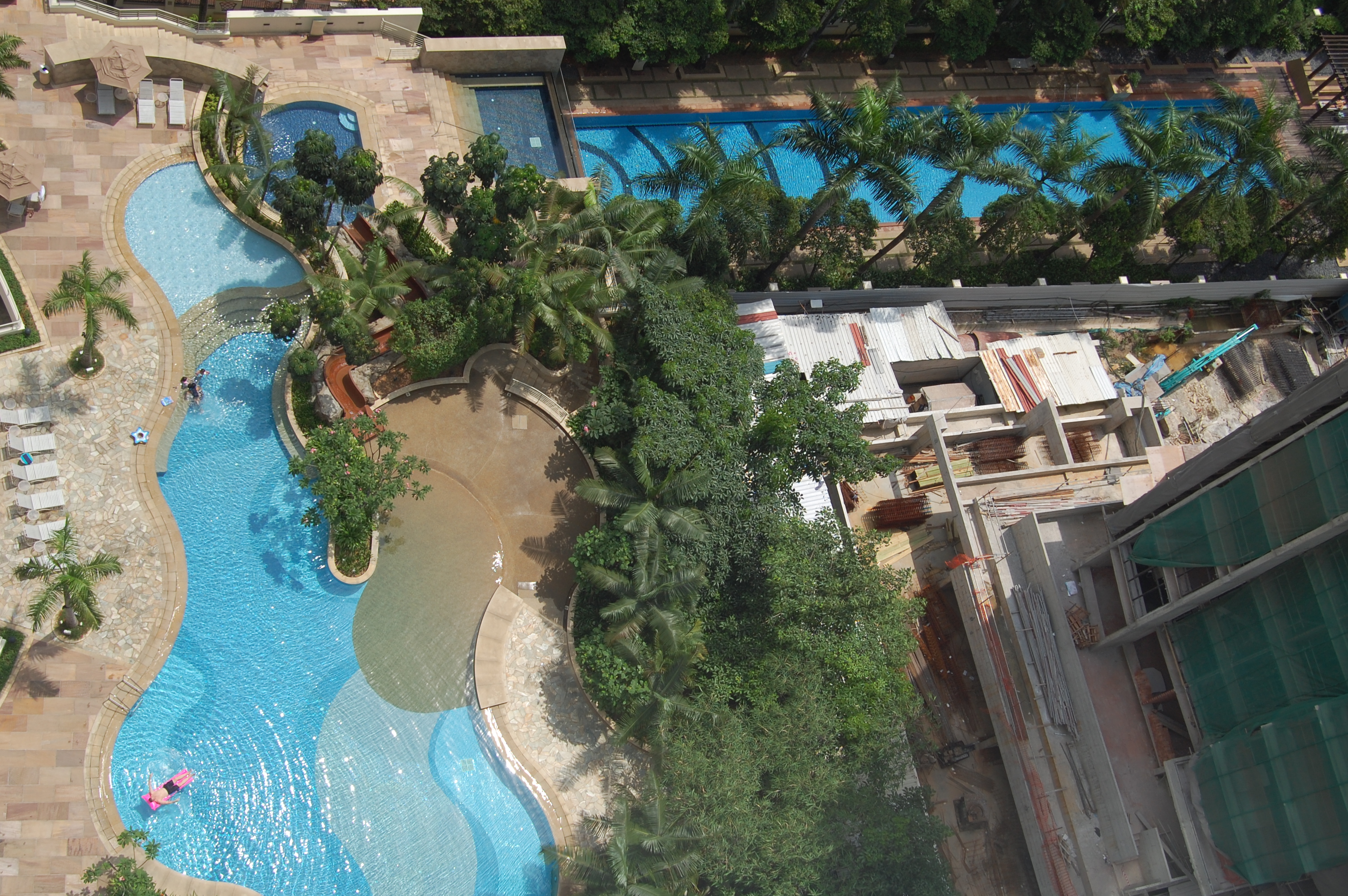 Here are the pools.   There are actually four and they were a big reason we chose this apartment.   There is a big play pool that has a water slide to a small play pool.  Then there is a jucuzzi pool an a 50m lap pool.