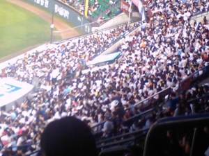 Second, instead of quietly sitting in your seats till something happens, each team has cheerleaders that lead various chants in Korean while their team is batting.