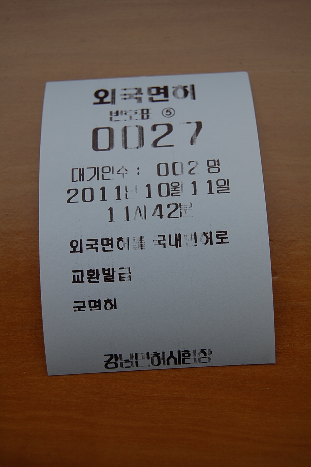 Second, go to the second floor of the Korean DMV and get a number that I unfortunately discarded. Don’t forget to bring your Kansas driver’s license, your Korean Alien Registration Card, your passport, and three color photographs. Thankfully, they have a special line for foreigners where the nice lady speaks ‘English’. Now wait 10 minutes for the nice lady behind the counter to tell you the note from your mother is wrong.