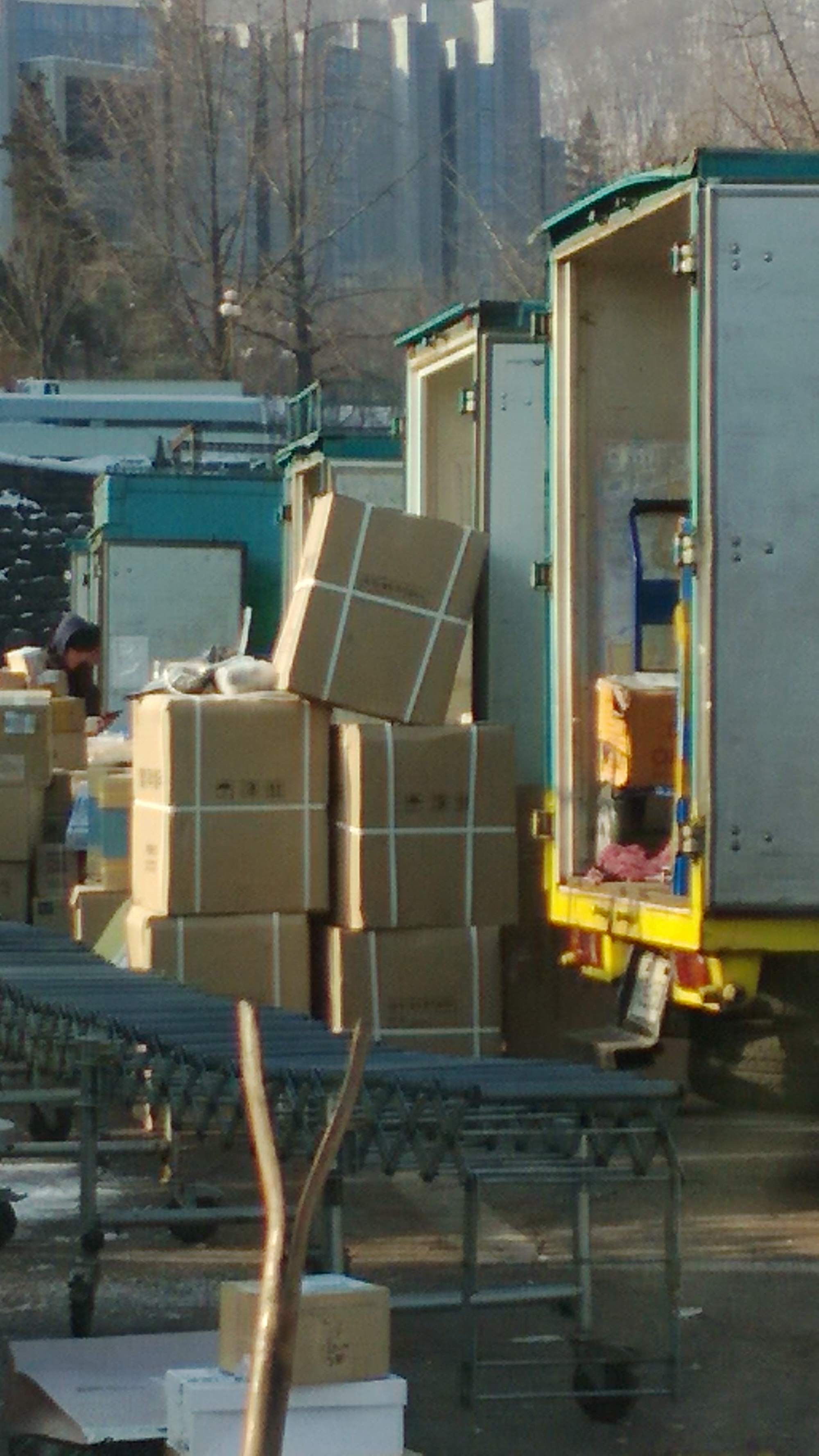 KGH (Korean UPS) pulls a bunch of their trucks into a parking lot (which is also a drive-in theatre) and sorts the packages by hand in the cold.